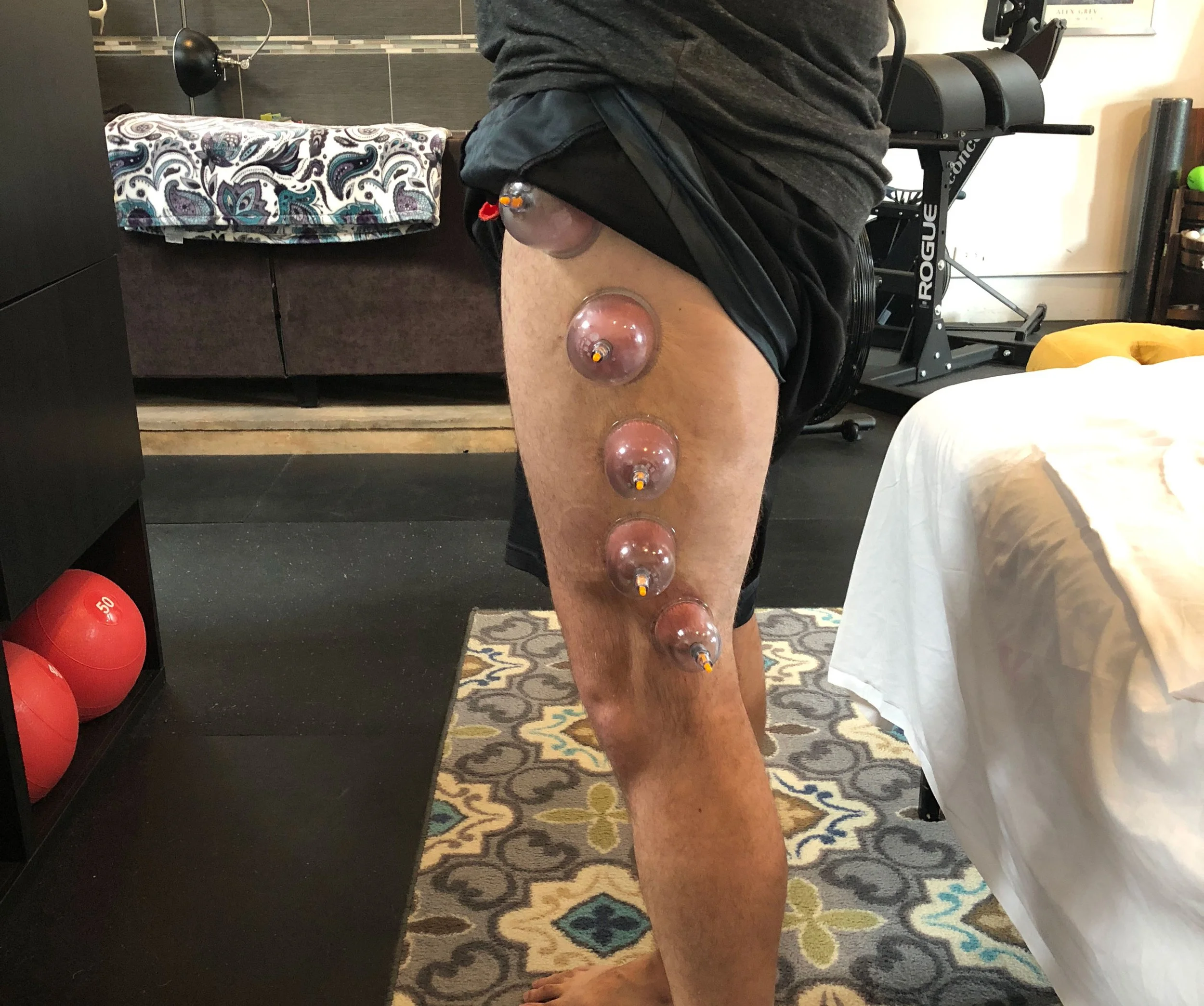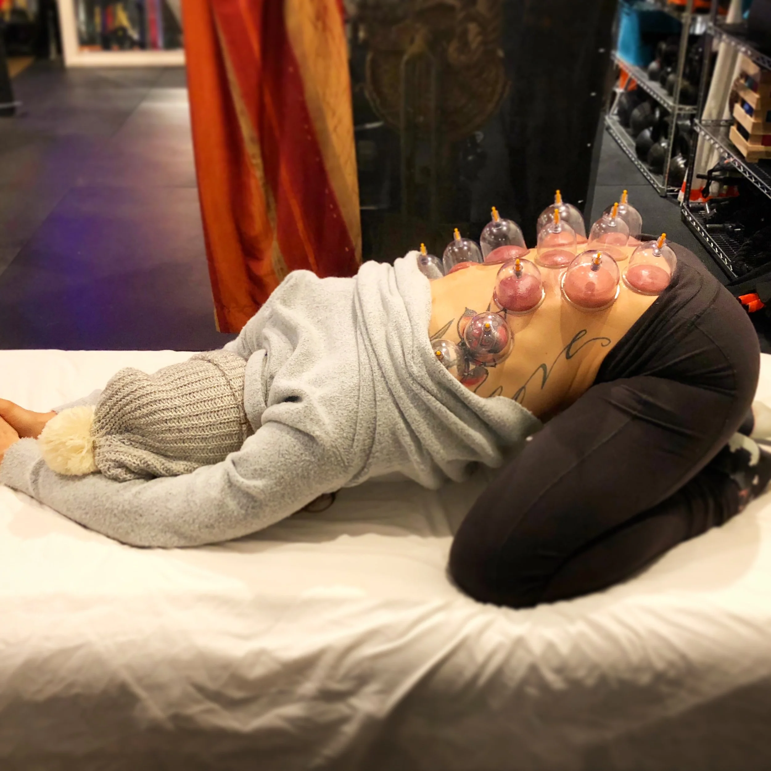 Actual client utilizing cupping therapy with slow, gentle movement to actively release full back tension and improve mobility.